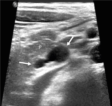 Abdominal ultrasonography reveals a lobulated cystic mass (arrows) without discernable solid components.