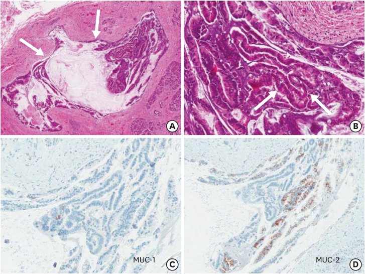 The initial preoperative laboratory data revealed an elevated amylase of 153 U/L and a lipase level of 71 U/L. The liver function tests were otherwise normal except for an elevated alkaline phosphatase of 429 IU/L. Abdominal ultrasonography was performed, which showed a lobulated cystic mass in the pancreas (Fig. 1), and subsequent computerized tomography (CT) showed a mildly inflamed pancreas with a 1.2×0.9×1.3 cm-sized low-attenuating cystic lesion with a pleomorphic appearance at the pancreatic uncinate process (Fig. 2). A magnetic resonance imaging (MRI) scan performed later for cystic evaluation showed pancreatic ductal communication with the cystic lesion along with downstream ductal dilatation. Furthermore, mild dilatation of the main pancreatic duct was observed (Fig. 3). The cystic lesion revealed communication with the dorsal duct and congenital anomaly of the pancreatic duct, and pancreas divisum was suspected due to a lack of fusion of the ventral and dorsal ducts and the common bile duct, which joins with the dorsal duct. Therefore, given the suspicion of IPMN and symptoms of pancreatitis, the patient underwent a pylorus-preserving pancreaticoduodenectomy. The histopathology report revealed BD-IPMN with intermediate-grade dysplasia. The depth was limited to the pancreas without invasion of the surrounding adjacent organs. Pancreatic intraepithelial neoplasia was not applicable, and the mucinous glands were of the intestinal type (Fig. 4).
