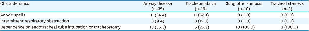 The operation types and postoperative outcomes of airway surgery are shown in Table 3. Of the 19 patients with tracheomalacia, 17 underwent aortopexy (15 open, 2 thoracoscopic) and all had a history of esophageal atresia (gross type C) surgery. Among the 15 patients who underwent open aortopexy, 3 underwent preoperative tracheostomy or intubation due to respiratory difficulty. Of these, 2 patients required tracheostomy due to delayed extubation during the immediate postoperative period, and one patient improved enough to extubate with sealing off the tracheostomy later. Postoperative complications occurred in 2 patients who underwent open aortopexy. One patient developed pneumonia with sepsis and was admitted to the intensive care unit for a prolonged postoperative period and maintained on tracheostomy at the last follow-up. The other patient developed recurrent pneumonia, and at follow-up, developed a respiratory arrest event secondary to airway obstruction, which required the initiation of advanced cardiovascular life support and intensive care unit admission.