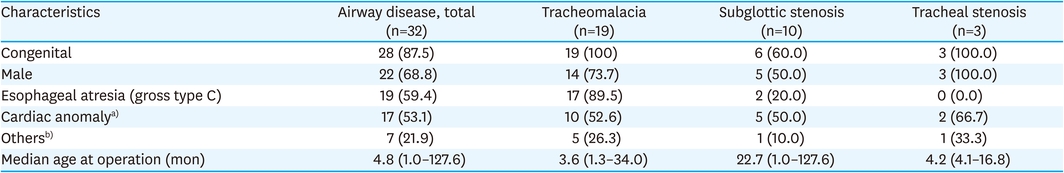 A total of 32 patients who underwent airway surgery were diagnosed with 3 types of operative airway diseases: tracheomalacia, subglottic stenosis, and tracheal stenosis (Table 2). Nineteen patients were diagnosed with congenital tracheomalacia, and 14 (73.7%) of them were male. Seventeen patients with tracheomalacia (89.5%) had a history of corrective surgery for esophageal atresia (gross type C) and 12 patients (63.2%) had other anomalies. Of the 10 patients with subglottic stenosis, 6 (60.0%) were congenital and 4 (40.0%) were acquired. Five patients (50.0%) with subglottic stenosis were male. Among the patients with acquired subglottic stenosis, 2 were due to trauma, and 2 were due to iatrogenic causes. Two patients with subglottic stenosis (20.0%) had a history of corrective surgery for esophageal atresia (gross type C), and 5 patients (50.0%) had other anomalies. All 3 patients with tracheal stenosis had congenital type disease, were male, and had accompanying anomalies. The age at the time of all airway surgeries ranged from 1.0 to 127.6 months (median, 4.8 months).