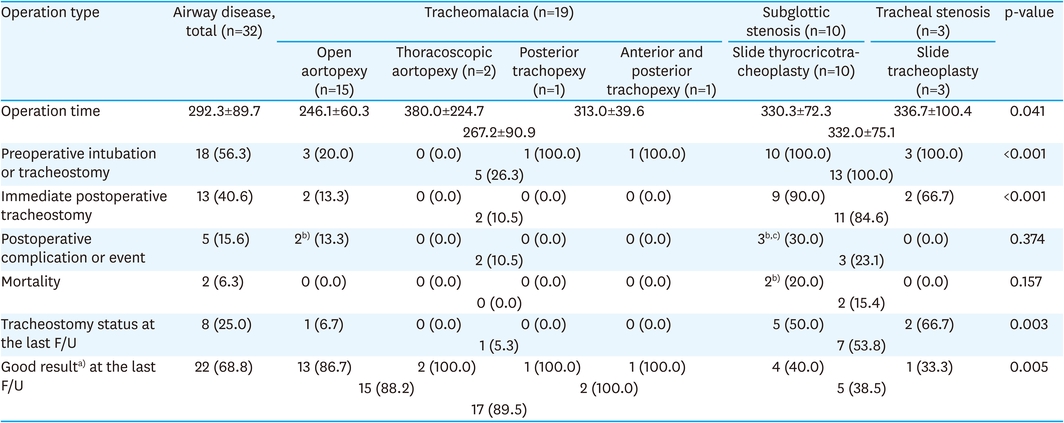 The postoperative follow-up period ranged from 1.2 months to 16.6 years (median, 4.5 years). There was a statistically significant difference between tracheomalacia and subglottic and tracheal stenosis. Patients with tracheomalacia had a significantly shorter operation time than those with subglottic and tracheal stenosis (267.2 vs. 332.0 minutes; p=0.041). In addition, there were significant differences in the results of preoperative intubation or tracheostomy (p<0.001), immediate postoperative tracheostomy (p<0.001), and tracheostomy status at the last follow-up (p=0.003). Moreover, good results at the last follow-up showed statistically significant differences (p=0.005).
