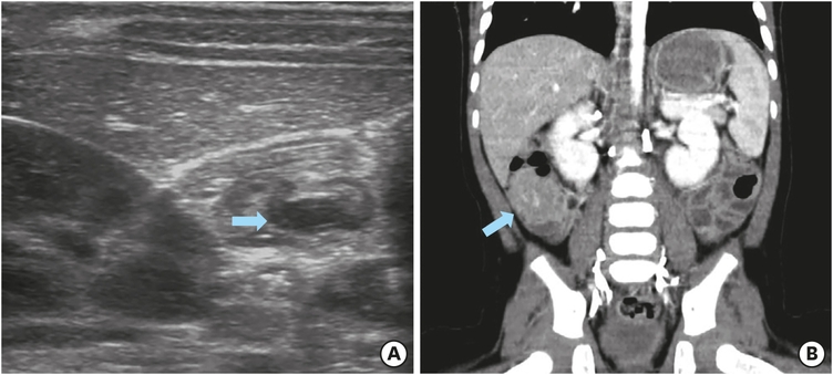 Ultrasonography and abdominal computed tomography findings for a 9-month-old boy, who was demonstrated to have recurrent intussusception: (A) Ultrasonography revealing recurred ileocolic intussusception with a lead point, an eccentric low echoic thickening (arrow) in the distal part of intussuscipiens. (B) Coronal abdominal computed tomography showing a focal enhancing wall thickening with recurred ileocolic intussusception (arrow). This focal enhancing lesion was thought to be the lead point.
