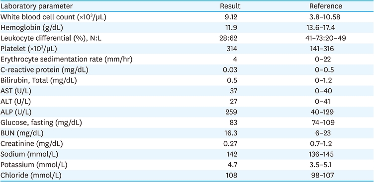 A 9-month-old male who was previous healthy came to the emergency room with complaints of bloody stools occurring in the evening of the previous day and the next morning, followed by vomiting. Abdominal ultrasonography was performed at another hospital. It showed suspicious findings for intussusception. The patient appeared more irritable than usual. He had bloody stools resembling red currant jelly. The patient was hemodynamically stable. On physical examination, his abdomen was not distended and the tenderness was not evident. Bowel sounds were slightly decreased on auscultation. Laboratory test results are shown in Table 1. Abdominal ultrasonography revealed ileocolic type intussusception with a size of about 1.8 cm in the right abdomen. There were mesenteric fat and enlarged lymph nodes inside. However, no mass or lead point was seen inside the intussusception. Doppler examination confirmed adequate blood flow inside the intestine. Fluoro-guided pneumatic reduction was successfully performed and the patient was hospitalized to monitor the progress.