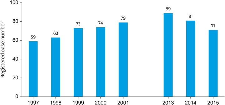 A total of 348 patients were enrolled in the first national survey, which included 59, 63, 73, 74, and 79 patients in 1997, 1998, 1999, 2000, and 2001, respectively. A total of 241 patients were enrolled in the second national survey, which included 89, 81, and 71 patients in 2013, 2014, and 2015, respectively (Fig. 1).