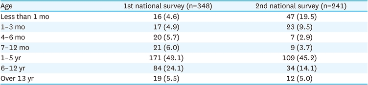The first national survey of KAPS for choledochal cysts in 2002 was conducted for 5 years, from 1997 to 2001, on 39 KAPS members working in 32 pediatric surgical centers in Korea; in 2003, the results of this survey were subsequently published in the Journal of the Korean Association of Pediatric Surgeons [1]. Afterward, a second national survey of KAPS was conducted to identify any differences or changes in demographic characteristics, clinical findings, diagnostic methods, treatment, and outcomes of pediatric patients with choledochal cysts. The second national survey in 2017 was conducted for 3 years, from 2013 to 2015. Before the survey, we made the case registration form, which included data regarding age, gender, clinical presentation, preoperative diagnostic work-up, type of choledochal cyst, treatment, and outcomes. The case registration form was sent to KAPS members and was completed in 16 pediatric surgical centers, with a total of 241 patients. The Todani classification system was used at the second national survey to classify the type of choledochal cyst. Comparing the data of the two national surveys was challenging since the case registration form used in the first and second national surveys were different; however, the results of these surveys were simply compared without statistical verification. The study protocol was approved by the Institutional Review Board (IRB) of Kyungpook National University Hospital (IRB No. 2023-09-025).