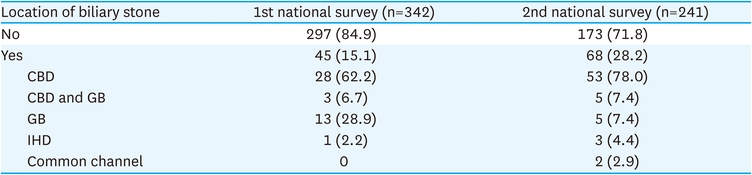 The most common type of choledochal cyst was type I in 238 (71.3%) and 176 (73.9%) patients in the first and second national surveys, respectively (Table 4). Regarding the presence or absence of a preoperative biliary stone, 297 (84.9%) and 173 (71.8%) patients did not have a biliary stone in the first and second national surveys, respectively. When preoperative biliary stones were present, they were most frequently located in the common bile duct in both the first and second national surveys (Table 5).