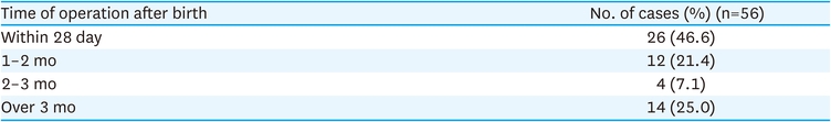 Twenty-six (46.6%) patients underwent surgery within 28 days of birth, 14 (25%) after 3 months of birth, and 12 (21.4%) within 1–2 months after birth (Table 8).