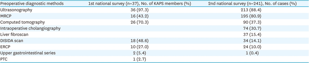 In the first national survey, KAPS members were asked about preoperative diagnostic methods, and ultrasonography (97%) and computed tomography (70%) were performed most frequently. In the second national survey of 241 patients, ultrasonography and magnetic resonance cholangiopancreatography were performed in 213 (88.4%) and 195 (80.9%) patients, respectively (Table 9). Furthermore, in the second national survey, 212 (88.0%), 15 (51.7%), and 6 (20.7%) patients did not undergo a preoperative procedure, underwent endoscopic sphincterotomy, and underwent percutaneous transhepatic biliary drainage, respectively (Table 10).