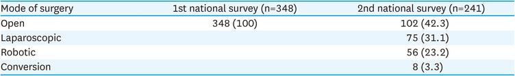 A total of 348 and 241 patients with choledochal cysts were enrolled in the first and second national surveys, respectively. The male-to-female ratio was 1:3.4 and 1:2.7 in the first and second national surveys, respectively. In both national surveys, abdominal pain was the most common clinical symptom. The most common type of choledochal cyst was type I in 71.3% and 73.9% of patients in the first and second national surveys, respectively. In the first national survey, all 348 patients underwent open surgery. However, in the second national survey of 241 patients, open, laparoscopic, and robotic surgeries were performed in 102 (42.3%), 75 (31.1%), and 56 (23.2%) patients, respectively. Cyst excision with Roux-en-Y hepaticojejunostomy was performed in 339 (98.8%) of 343 patients in the first national survey and 240 (99.6%) of 241 patients in the second national survey.