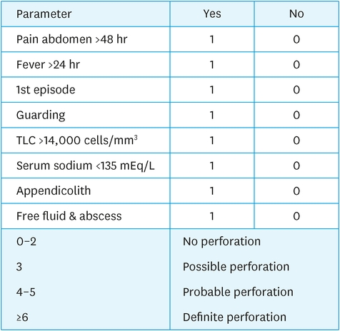 In conclusion, longer duration of symptoms, leukocytosis, serum sodium <135 mEq/L, appendicolith and free fluid/abscess on ultrasonography are good predictors of perforated appendicitis. The I Gee Score can accurately identify perforated appendicitis and results in effective usage of health care resources.