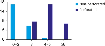 On applying the I Gee score on our patient data for both the non-perforated and perforated groups and further categorization we noted that 16 were non-perforated while 0 were perforated at a score of 0–2 while 1 was non- perforated and 25 were perforated at a score of 4 and above (Table 4, Fig. 2).