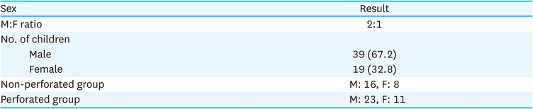 During the study period a total of 134 children were diagnosed with acute appendicitis of which 58 underwent appendectomy. Thirty-four were found to be perforated (P group) while 24 were non-perforated (NP group) during surgery. The age of the children ranged from 2-year 1 month to 17-year 4 month with mean of 8.83 year. There was no significant statistical difference of age between NP and P groups (NP: 9.73±3.97, P: 8.18±4.05; Mann–Whitney U test, p=0.08) (Table 1).