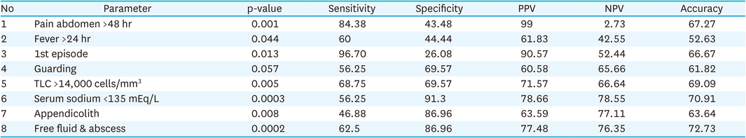Significant 8 parameters with p<0.05 with sensitivity, specificity, PPV, NPV, and accuracy