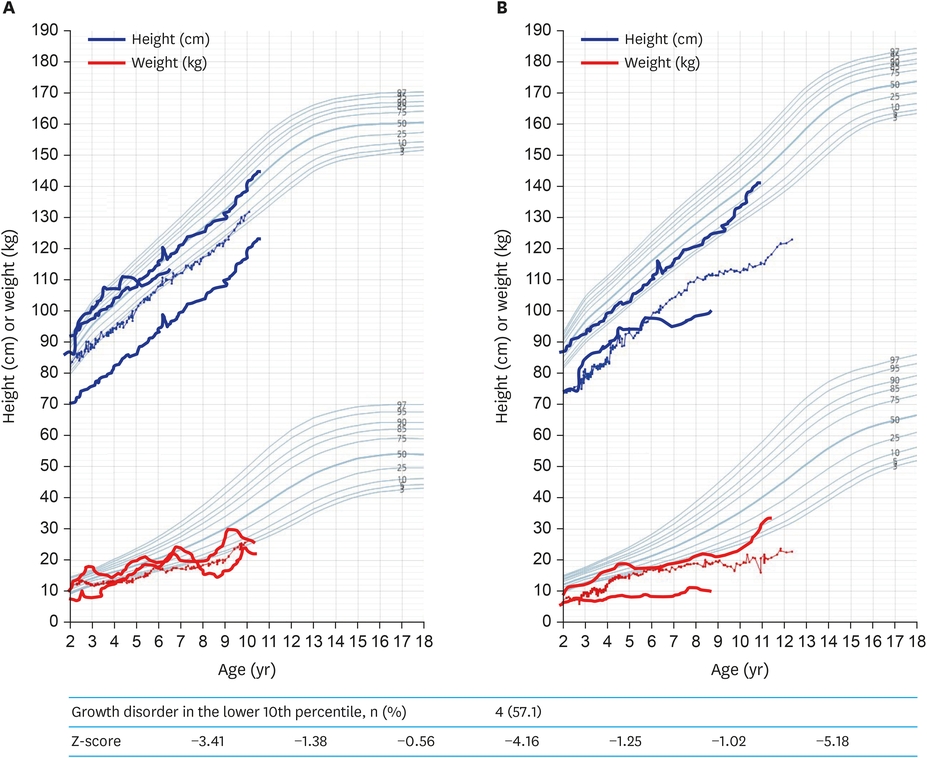 Four of the seven children were in the 10th percentile for growth, and all seven were in the 50th percentile for height and weight. However, height and weight slope were almost the same as the average for children of the same age (Fig. 1).