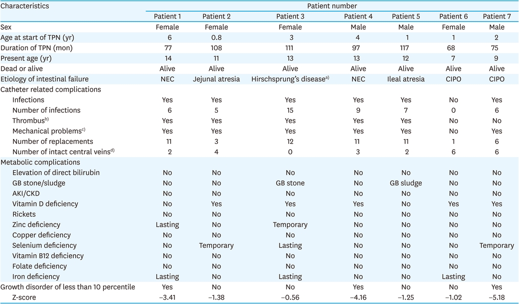The seven children who experienced complications of PN included four boys and three girls. Their median age of PN initiation was 2 years (range: 0.8–6 years) and their median TPN duration was 97 months (range: 68–117 months). The demographic characteristics of these patients are presented in Table 1. At present, their mean age is 11 years and none has died. Evaluation of diseases requiring TPN showed that two patients each had necrotizing enterocolitis (NEC), congenital intestinal obstruction, and chronic pseudo-obstruction, and one had Hirschsprung’s disease (Table 1). All seven patients were able to take some foods by mouth, consuming a minimum of 100 mL of balanced amino acid nutrition, such as “Monowell,” and as much porridge or rice as desired. In addition, two children had gastrostomy, requiring enteral feeding.