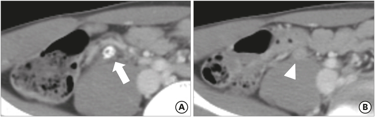 Preoperative ACT findings for a 13-year-old male patient, who was demonstrated to have lymphoid hyperplasia: (A) appendicolith (arrow) and (B) luminal distension (arrowheads) were observed, but there were no other diagnostic abnormalities in ACT.
