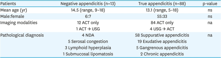 We performed a retrospective review of the records of 620 pediatric patients who underwent surgery for acute appendicitis between January 1, 2007 and December 31, 2020. We re-reviewed the scans in 101 patients who were deemed to have unclear preoperative findings on ACT, looking for the following features: periappendiceal fat infiltration, periappendiceal fluid collection, appendiceal wall thickening, appendiceal gas, and right lower quadrant lymphadenopathy. We then compared the presence of these features between patients with true appendicitis and those who underwent negative appendectomy.