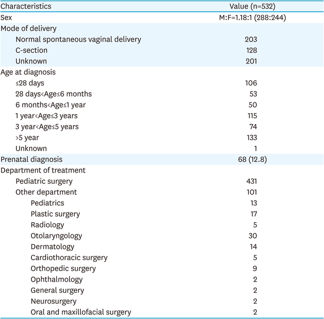 A total of 532 patients with lymphangioma from 18 institutes were registered for the study (Fig. 1). Although 550 patients were reported, 18 patients were reported by 2 institutes. Therefore, we unified the data of these patients. The patients’ demographics and clinical characteristics are summarized in Tables 1 and 2. Age at diagnosis varied; 39.3% of patients (209/532) were diagnosed in the infant period, and 25% (133/532) were diagnosed after the age of 5. Only 12.8% of patients (68/532) were diagnosed postnatally. The majority of patients (81.0%) were treated by pediatric surgeons. Most patients (94.9%) had a lesion at a single site, but 27 patients had multiple lesions at more than one site. The most common symptom was mass, followed by pain. The most common imaging study was ultrasound, followed by magnetic resonance imaging. We classified lymphangioma with a diameter of more than 1 cm as macrocystic. Macrocystic lymphangioma was the most common type of lymphangioma, and the median diameter size was 4.8 cm.