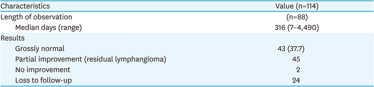 Patients who underwent observation only are summarized in Table 3. A total of 114 patients (21.4%) did not undergo any specific treatment, and the median observation period was 316 days. Among the patients in this group, 67.9% (88/114) showed grossly normal or partially improved appearance.