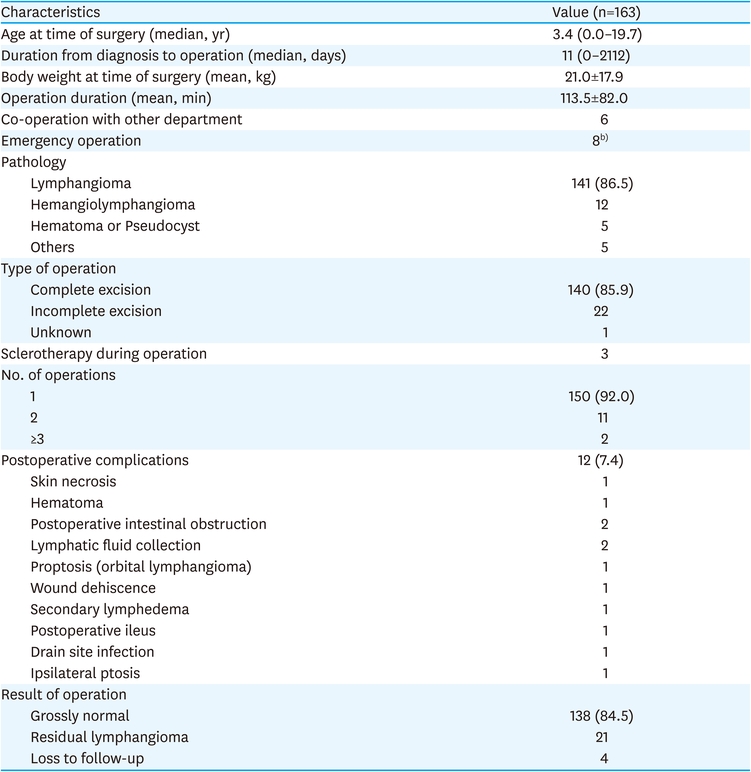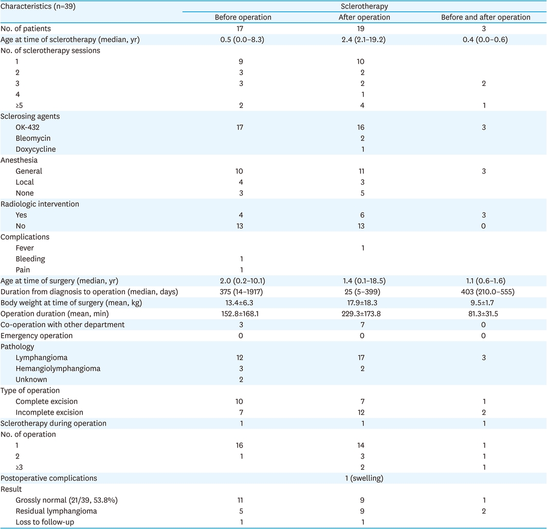 A total of 163 patients (30.6%) underwent an operation. The predominant operation site was the head and neck, followed by the abdominal wall and flank. Characteristically, lesions in the intra-abdominal and pelvic cavity were more common in this group compared to the other treatment method groups. The most common histopathological diagnosis was lymphangioma, followed by hemangiolymphangioma. Most patients underwent complete excision in a single operation. Only 8% (13/163) of patients required more than 1 operation. Three patients underwent sclerotherapy during operation. Postoperative complications were not common; only 7.4% of patients experienced complications, and complications were of various kinds. After operation, 84.5% (138/163) of patients showed grossly normal results or no residual lesions (Table 4).
