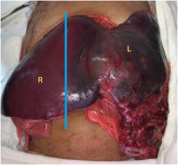 A large mass was noted in the left lobe of the liver in segments IVa, IVb, and III, 10×10 cm in size, hard in consistency, and irregular surface, with contiguous involvement of greater omentum (Fig. 2). Adhesions are present between the mass and the transverse colon. Inflow control was taken by portal dissection, and the left hepatic duct, left branch of the portal vein, and left branch of the hepatic artery was looped. A clear line of demarcation appeared extending from gallbladder fossa to left hepatic vein. The tumor with the left lobe of the liver has been excised in toto. The cut section showed a solid, grey-white, irregular tumor with bile staining and peripheral congested liver parenchyma (Fig. 3). The bowel and rest of the solid organs, appeared healthy. His postoperative course was uneventful, and he was discharged on postoperative day 12.