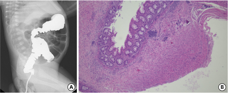 Result of barium study and pathologic findings. (A) Barium enema showing a relatively narrow area of descending colon, suspicious of transition zone. (B) Absence of ganglion cells was confirmed by hematoxylin and eosin stain at the resected stoma site.