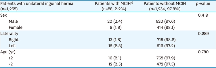 In total, 28 (2.2%) children without CPPV based on a thorough contralateral transinguinal exploration developed MCIH, which required subsequent additional operation. Twenty boys and eight girls were diagnosed with MCIH. MCIH occurred in 13 of the right inguinal hernia patients and 15 of the left hernias. The average age of patients who developed MCIH was 37 months (n=16, children aged over 2 years and n=12, children aged below two years). There was no correlation between gender, age, and laterality of initial hernia and the occurrence of MCIH (Table 3).