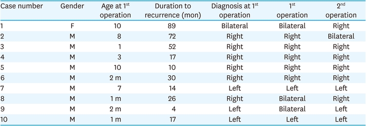 There were 10 cases (0.5%) of recurrence (one girl: nine boys). All the recurrences were detected in the first hernia side. One boy initially had a right-side hernia repair without CPPV, but the Lt-CPPV was found in the second operation (Table 4).