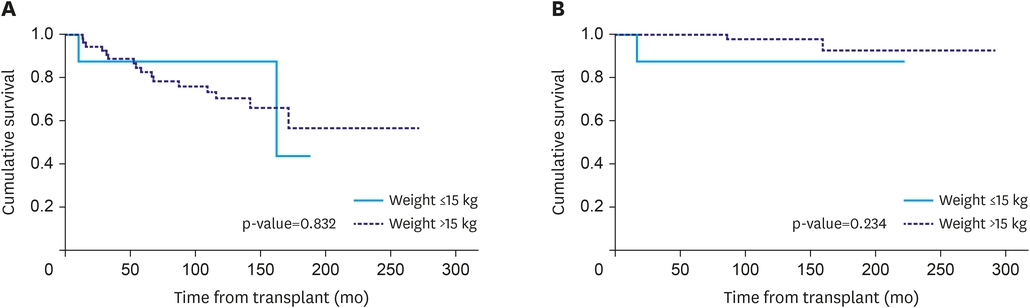 Graft survival was 88.9% and 88.9% at 1 year and 5 years, respectively (Fig. 1A). Graft survival of children who weighed ≤15 kg at the time of KT was not different compared to children who weighed more than 15 kg (p=0.832). Patient survival was also not significantly different between the 2 groups (p=0.234, Fig. 1B).