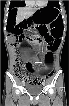 Coronal abdominal computed tomography showing a dilated sigmoid colon with whirl pattern (arrow) of the mesentery.