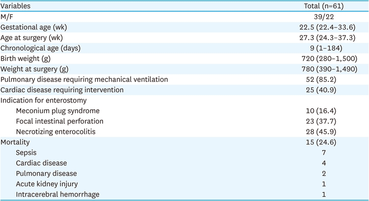 Sixty-one infants (39 males, 22 females) who underwent enterostomy were identified. Patient demographics are listed in Table 1. The median gestational age was 22.5 weeks (22.4–33.6), and the median birth weight was 720 g (280–1,500). The median preoperative chronological age was 9 days (1–184), whereas the median preoperative age was 27.3 weeks (24.3–37.3). The median preoperative weight was 780 g (390–1,490). Fifty-two patients (85.2%) required mechanical ventilation for pulmonary conditions, and 25 patients (40.9%) needed interventions, including surgery, for heart conditions. The causative diseases included NEC, FIP, and meconium plug syndrome (MPS); NEC/FIP had the highest incidence (51/61, 83.6%). Fifteen cases of neonatal mortality were noted. However, none of these deaths were associated with enterostomy, and approximately 50% were attributed to neonatal sepsis from NEC (7/15, 46.7%).