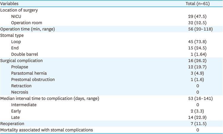 Features related to surgery are listed in Table 2. The median operation time was 56 minutes, and enterostomy creation was the only surgical procedure performed. The most frequent type of enterostomy was loop-enterostomy (46/60, 76.7%), followed by end-enterostomy (14/60, 23.3%) and double-barrel enterostomy (1/60, 1.6%). Sixteen patients showed stomal complications (26.2%), including parastomal hernias, stomal prolapses, and prestomal obstructions. The most frequent complication was stomal prolapse (12/61, 19.7%). The rate of reoperation was 11.5% (7/61), most commonly for stomal prolapses (6/12, 50%) and prestomal obstructions (1/1, 100%). Among the six patients who underwent reoperation for a prolapse, there were five cases of bowel necrosis and one case of take-down. Patient mortality was not associated with stomal complications.