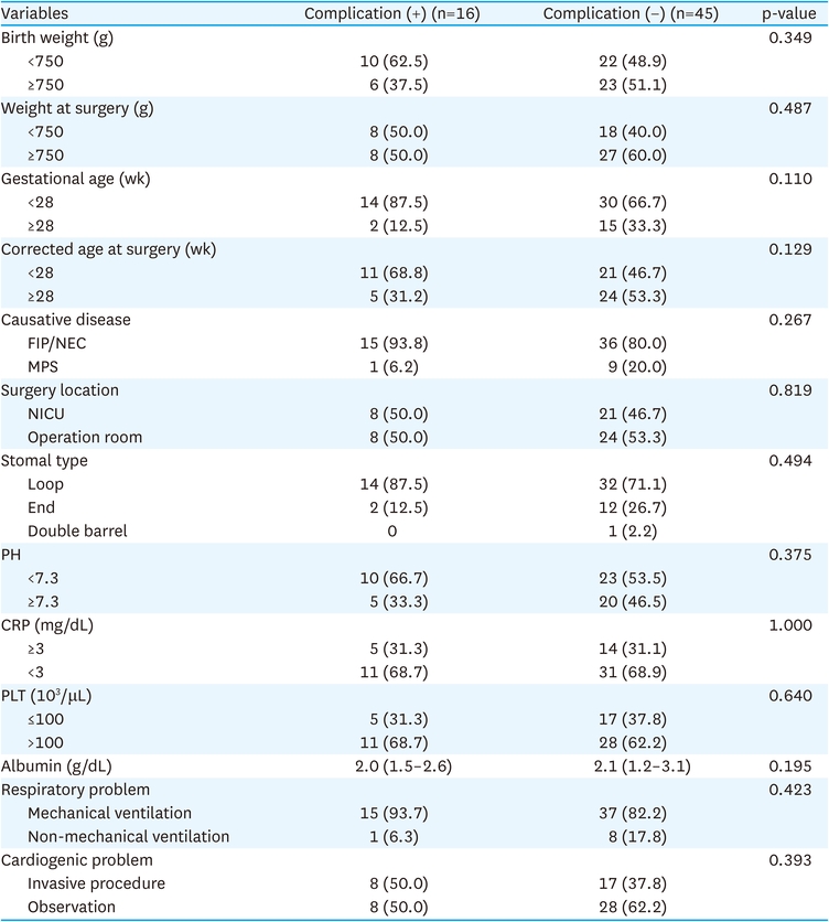 Correlations between the rate of complication and causative diseases are noteworthy. Although not statistically significant, the FIP/NEC group had thrice more complications than the MPS group. It is assumed that the extent and degree of the affected bowel were greater in FIP/NEC than those in MPS [16]. Factors, such as immature immunology and decreased metabolic response to surgery, also contributed to this. A previous study reported that the rate of neonatal sepsis associated with NEC was 26%–40% [19, 20]; this rate was higher than that in immunocompetent patients [21]. The high complication rate observed in premature infants may be attributed to the difficulties in maintaining appropriate metabolic responses to acute injury or immature immunological functions.