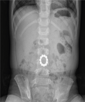 Abdominal X-ray demonstrating 11 bead-shaped magnets in mid abdomen.