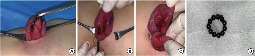 A 2-year-old boy presented with abdominal pain and bilious vomiting for 6 days. He had a fever for 3 days. He ingested multiple bead-shaped magnetic toys. On admission, he had abdominal pain and mild fever (body temperature, 37.5°C). His abdomen was soft, mildly tender, and not distended on physical examination. Laboratory findings were normal. Abdominal radiography revealed no free air and 11 bead-shaped magnets arranged in a circle (Fig. 1). Serial radiographs were followed up for 2 days. They showed no significant change in the position of the magnets, and the abdominal pain did not improve. Therefore, exploratory laparotomy was performed. Multiple perforations of the jejunum caused by the loops of magnets were found approximately 15 and 35 cm distal to the Treitz ligament. It was not appropriate to perform primary repair because there are too many perforation sites in the short bowel loop and discoloration was observed. Twenty-five cm of the jejunum, including all 5 perforation sites, was resected, and a primary anastomosis was made (Fig. 2). He had an uneventful postoperative recovery course and was discharged on the fifth postoperative day.
