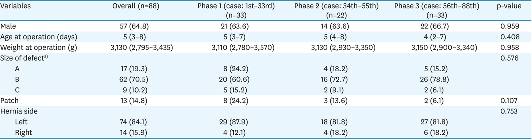 Based on the above results, baseline clinical characteristics were compared for each phase in the learning curve of operator A (Table 1). There were no significant differences in age or weight at the time of surgery of each patient. CDHSG type B and left side defects were most common in all phases. The patch application rate decreased by 24.2% in phase 1, 13.6% in phase 2, and 6.1% in phase 3, which was not statistically significant (p=0.107).