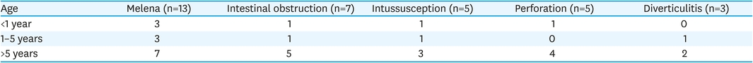 Twenty-five cases occurred in boys and 8 cases occurred in girls, with a male to female ratio of 3.1:1. The sex distribution according to the presentations was prevalent in men in the case of melena, intestinal obstruction, and diverticulitis, but there was no difference between men and women in the case of intussusception and perforation. At the time of diagnosis, the age ranged from 6 months to 17 years, with an average of 92.4 months. In the age distribution, 6 patients (18.2%) were under 1 year of age, 6 patients (18.2%) were 1 to 5 years of age, and 21 patients (63.6%) were older than 5 years old. The mean age according to the presentations was 7.2 years, 9.2 years, 6.8 years, 8.4 years, and 6.8 years in melena, intestinal obstruction, intussusception, perforation and diverticulitis, respectively. Tables 1 and 2 summarized the sex and age distribution according to the clinical presentation.