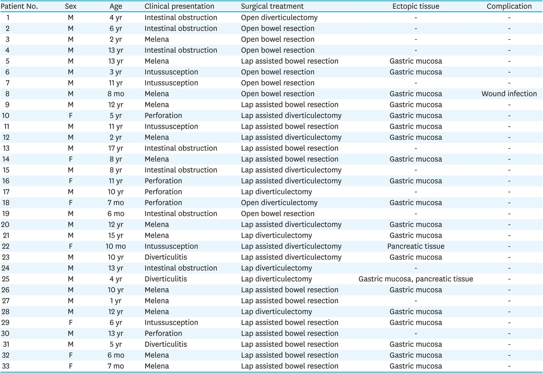 When the base of MD was clean, diverticulectomy was performed, and when MD was accompanied by inflammation or ischemic change, bowel resection was performed. In addition, even if diverticulectomy was first considered at the time of surgery, if the possibility of remnant ectopic tissue or bowel stenosis was high, bowel resection was performed. Out of total 33 patients, 12 underwent laparoscopic assisted bowel resection, 7 underwent laparoscopic assisted diverticulectomy, 5 underwent laparoscopic diverticulectomy, 7 underwent open bowel resection, and 2 underwent open diverticulectomy. There was only 1 postoperative wound infection in all 33 cases.