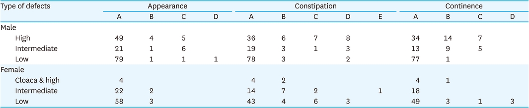 The second national survey included three criteria to evaluate the functional outcomes after surgery: anal appearance, constipation, and continence (Table 3). In male patients, as for the shape of the anus, the low type group had the best result with 79 patients (96.3%) having normal appearances. Regarding presence of constipation, 78 patients (94.0%) in the low type group did not have constipation. Defecation control was also normal in 77 patients (98.7%) in the low type group. In female patients, similar to the results in male patients, low type group had the best outcome regarding shape of anus with 58 of the patients (95.1%) having normal appearances. Regarding presence of constipation, 43 patients (76.8%) in the low type group did not have constipation. Defecation control was also normal in 49 patients (87.5%) in the low type group (Table 4).