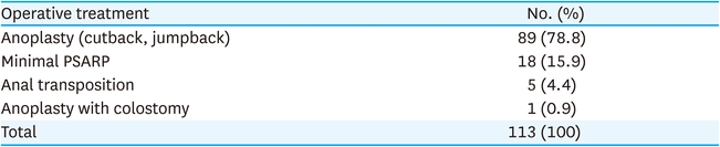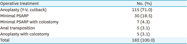 For the low defects in female patient, 89 cases (78.8%) were treated with anoplasty and minimal PSARP were performed in 18 cases (15.9%) (Table 8). For vestibular fistula, various surgical options were performed: 41 cases (39.8%) were minimal PSARP with colostomy, 22 cases (21.3%) were minimal PSARP without colostomy, 19 cases (18.4%) were anoplasty, and 12 cases (11.7%) were anoplasty or fistula widening and then minimal PSARP (Table 9). For vaginal fistula, PSARP with colostomy were performed in 6 cases (46.1%) and laparoscopic surgery with colostomy were performed in 5 cases (38.5%). For persistent cloacas, 15 cases (75.0%) were treated with total repair of cloacas with colostomy or ileostomy and 2 cases (10.0%) were performed with colostomy or ileostomy only. Two cases (10.0%) were performed with colostomy or ileostomy with cystostomy (Table 10). Other cases included 7 cases of H-type rectovestibular fistula which were treated with mucosal advancement flap and 2 cases of rectal stenosis which were treated with PSARP with colostomy or pull-through operation with ileostomy.