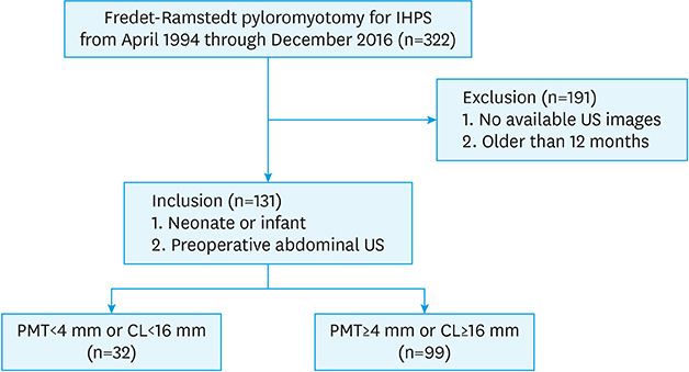 We reviewed the medical records of 322 pediatric patients who underwent Fredet-Ramstedt pyloromyotomy after diagnosis of IHPS from May 1994 to December 2016. All were confirmed with pyloric muscle hypertrophy in the operational field according to their operational record. Among them, electronically accessible ultrasonic records were available for 131 patients. As a result, 131 patients were selected for the final analysis (Fig. 1). The patients were divided into two groups according to the current IHPS criteria used in Korea. Thirty-two patients with PMT thinner than 4 mm or canal length shorter than 16 mm were grouped as discordance group and 99 patients who fulfilled the criteria for both dimensions were called concordance group.