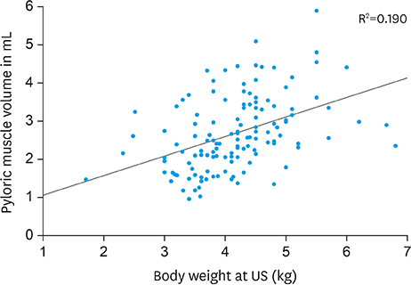 Student's t-test and Mann-Whitney U test were used to compare the continuous variables between the two groups, which were expressed as mean standard deviation or median (interquartile range [IQR]). The categorical variables were presented as frequency (%) and statistically compared using the χ2 or Fisher's exact test when appropriate. Related factors of the patients and pyloric muscle volume were evaluated by Pearson correlation and partial correlation. Multiple linear regression analysis was performed for variables that showed statistical significance in correlations. Statistical analysis was performed using SPSS® Statistics 25.0 (IBM Corp., Armonk, NY, USA).