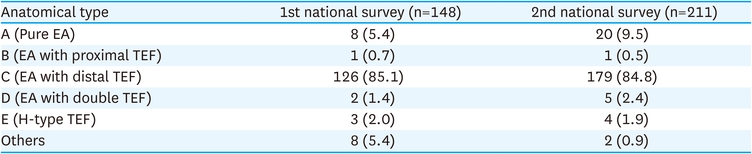 Type C was the most common anatomical type of EA/TEF in both surveys, with 126 (85.1%) and 179 (84.8%) patients, respectively, followed by type A with 8 (5.4%) and 20 (9.5%) patients, type D with 2 (1.4%) and 5 (2.4%) patients, type E with 3 (2.0%) and 4 (1.9%) patients, and type B with 1 (0.7%) and 1 (0.5%) patient (Table 4).