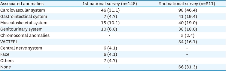 The cardiovascular system was the most commonly involved in associated anomalies, with 46 (31.1%) and 98 (46.4%) patients, followed by the musculoskeletal system with 15 (10.1%) and 40 (19.0%) patients in the first and second national surveys, respectively (Table 5).