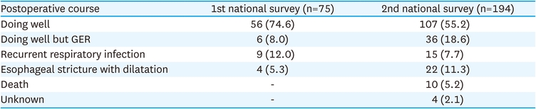 In the first national survey, 126 of 148 patients—excluding 22 patients who died or withdrew before surgery—underwent open surgery. This group included 96 (76.2%) who underwent primary repair, 13 (10.3%) who underwent delayed primary repair, and 17 (13.5%) who underwent staged repair. In the second national survey, surgical treatment methods were analyzed for 194 of 211 patients, after excluding 9 patients who died before surgery and 8 with insufficient data. Open surgery, thoracoscopic surgery, and open conversion were performed on 152 (78.4%), 34 (17.5%), and 6 (3.1%) patients, respectively. Of these, 160 patients (82.5%) underwent primary repair, 26 (13.4%) underwent delayed primary repair, 4 (2.1%) underwent gastric pull-up, and 2 (1.0%) underwent gastric tube creation (Table 6).