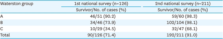 The survival rates, according to the Waterston classification, were 90.2% and 98.3% in group A, 73.9% and 98.1% in group B, and 34.5% and 68.1% in group C for the first and second national surveys, respectively (Table 9).