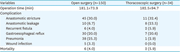 For both open and thoracoscopic operations, the mean operation times were 181.1±73.9 and 182.5±94.9 minutes, respectively. Postoperative complications following open and thoracoscopic procedures anastomotic strictures in 45 (30%) and 11 (32.4%) patients, anastomotic leakage in 10 (6.7%) and 8 (23.5%) patients, recurrent fistulas in 6 (4%) and 2 (5.9%) patients, gastroesophageal reflux in 30 (20%) and 7 (20.6%) patients, pneumonia in 38 (25.3%) patients and 1 (2.9%) patient, and wound infections in 5 (3.3%) and 0 (0%) patients, respectively. Six patients (4%) died following open surgery and two patients (5.9%) following thoracoscopic surgery (Table 10).