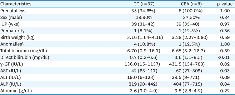 Forty-five of the 52 patients (86.5%) were diagnosed with CC or CBA, indicating that most cases with perinatally detected subhepatic cysts were associated with biliary system disorders. Among these, CBA accounts for 17.8%. Table 2 compares patients diagnosed with CC and CBA. The two groups had no significant differences in prematurity (8.1% vs. 12.5%, p=0.56), birth weight (median, 3.16 vs. 3.28 kg, p=0.59, and combined anomalies (10.8% vs. 12.5%, p=1.00). There were statistically significant differences between the two groups in the level of direct bilirubin (median, 0.7 vs. 3.6 mg/dL, p<0.01), γ-glutamyl transferase (γ-GT) (median, 136.0 vs. 431.5 IU/L, p=0.02), aspartate aminotransferase (AST; median, 42 vs. 60 IU/L, p=0.03), and alkaline phosphatase (ALP; median, 219 vs. 404 IU/L, p=0.04). Of the 45 patients, 43 had a subhepatic cyst observed on prenatal ultrasound, whereas cysts were first observed within the first week after birth in two patients. One patient had intrauterine growth restriction (IUGR), but no cyst was observed on the prenatal ultrasound performed at our institution. However, a cyst was detected by ultrasonography after birth. The other patient was referred from another hospital with hematochezia, and a cyst was incidentally observed on ultrasonography. There was no record of prenatal ultrasound images, and the parents provided no statements regarding the prenatal ultrasound for this patient. Notably, both the patients were diagnosed with CC.