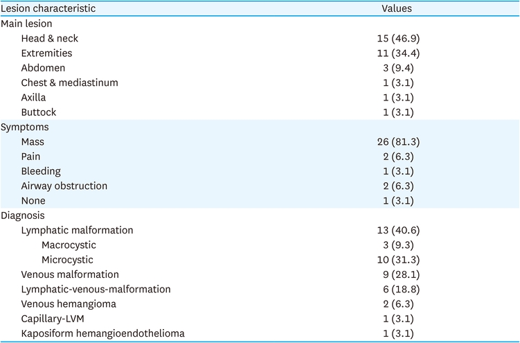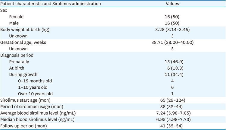 In total, 32 patients had sirolimus treatment over 2 years between January 2018 and December 2021 at Asan Medical Center. Patient and tumor characteristics are summarized in Tables 1 and 2. There is one patient, classified as having “none” symptoms, who had microcystic venolymphatic malformation in the mesentery which causing no discomfort for the patient. When divided by age at the initiation of medication, there were 5 patients aged less than a-year-old, 18 patients aged less than 10-year-old, 8 in their teens and 1 aged 20 or older. Median start age of sirolimus was 65 (29–124) months and median period of usage was 38 (32–44) months. We tried to maintain trough level of sirolimus between 8 and 12 ng/mL, but the median therapeutic drug monitoring (TDM) level was 6.95 (5.98–7.73) ng/mL. In cases where patients exhibited infection symptoms or severe side effects such as stomatitis, sirolimus was temporarily discontinued, during which time some of the TDM was measured. Since these inaccurate TDM values were included, the median value is lower than the target range we aimed for.
