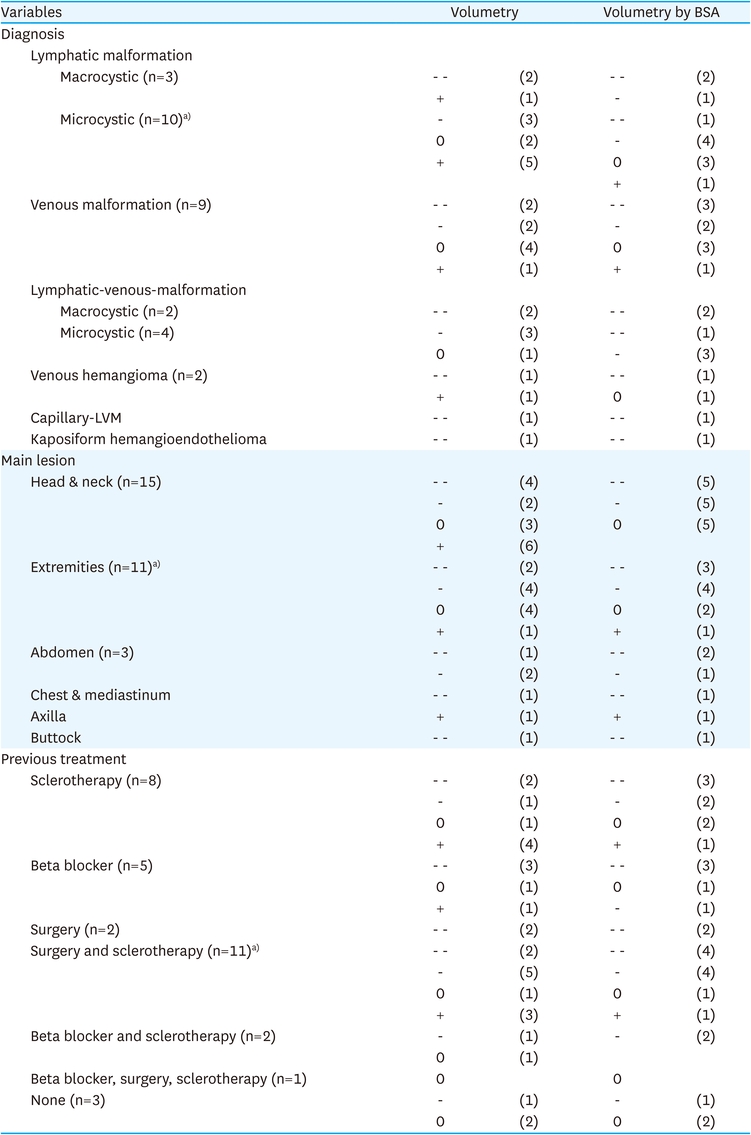 There is no optimal measurement of disease response in patients with complicated vascular anomaly, because of its various characteristics. In this study, treatment efficacy was measured by volume change before and after 2 years of sirolimus treatment, measured by volumetry in MRI. We used in-house computer aided volumetry software obtained from patient’s MRI. Despite a reduction in the size of the lesion clinically or as perceived by the caregiver, there are instances where the absolute size of the lesion measured on MRI appears to increase as patients grow. Therefore, we measured volumetry on MRI divided by the patient’s body surface area (BSA) to assess relative size changes. Also, we reviewed all patients’ MRI scans in collaboration with 2 pediatric radiologists, reassessing the patients’ diagnoses according to the ISSVA classification.